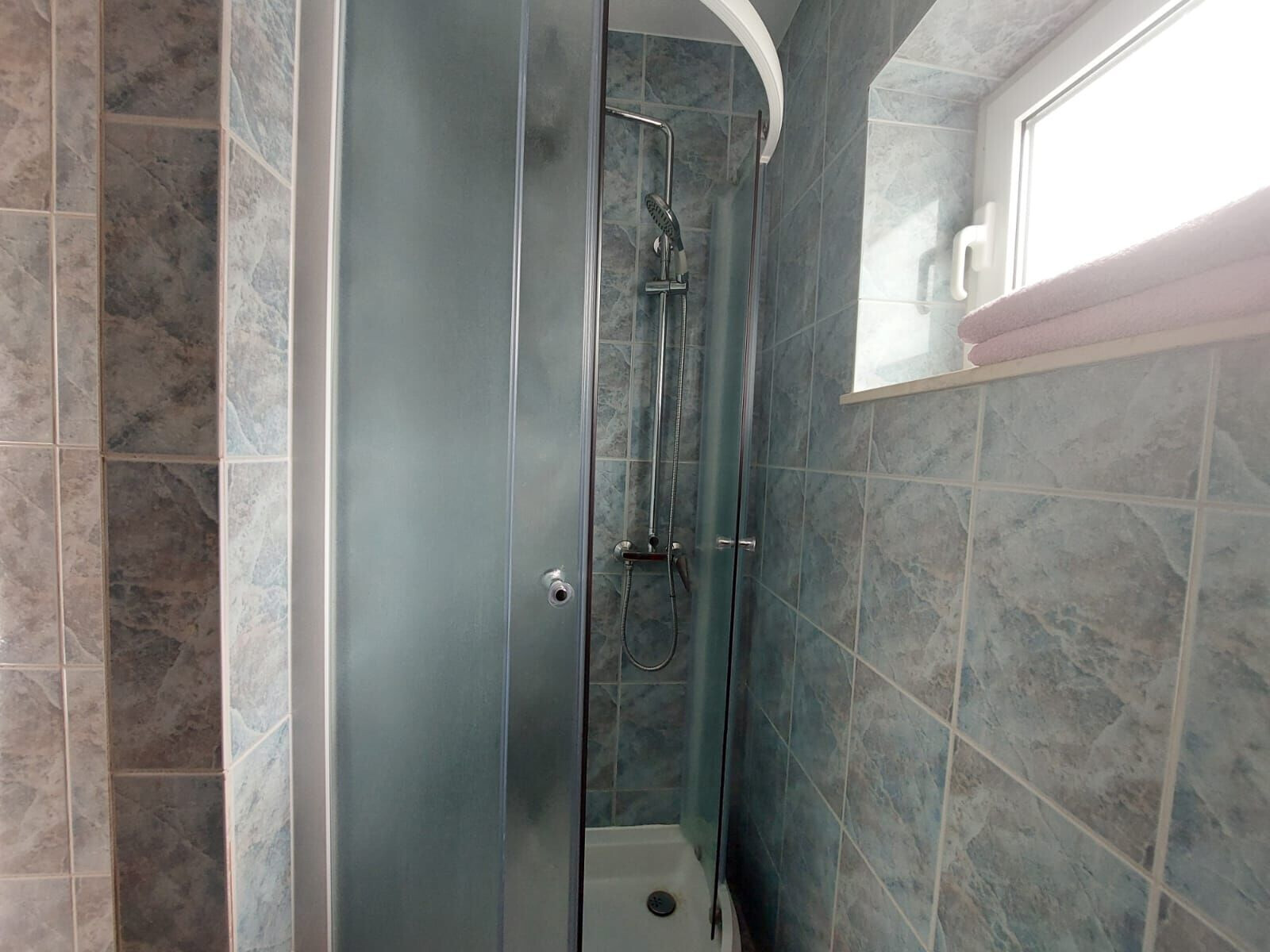 • prysznic, prysznicowa kabina, suszarka do włosów, recznik.