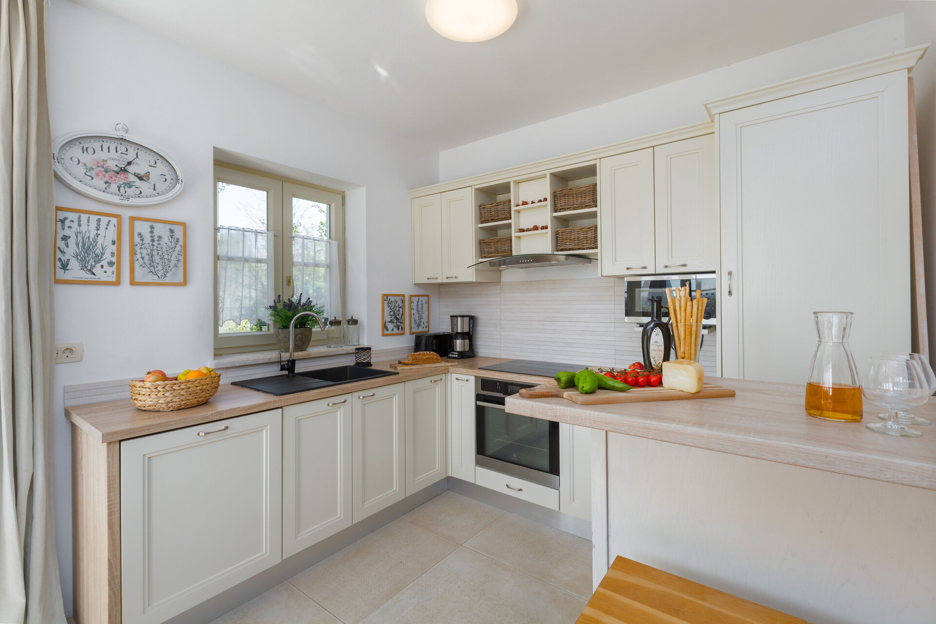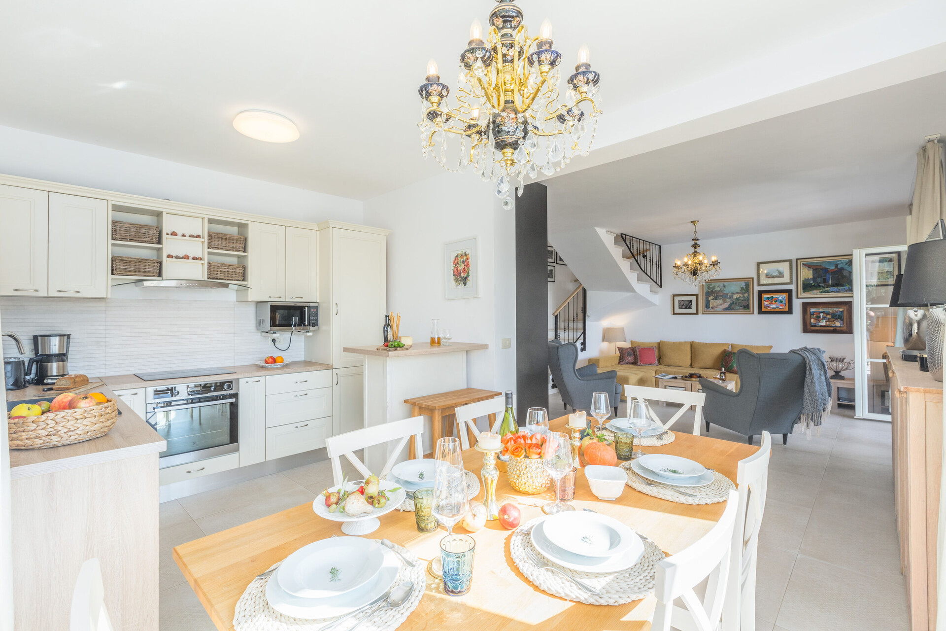 • stół i krzesła, zlew, piekarnik, lodówka, zamrażarka, czajnik, ekspres do kawy , mikrofalówka, toster, zmywarka, żelazko, kuchenka.