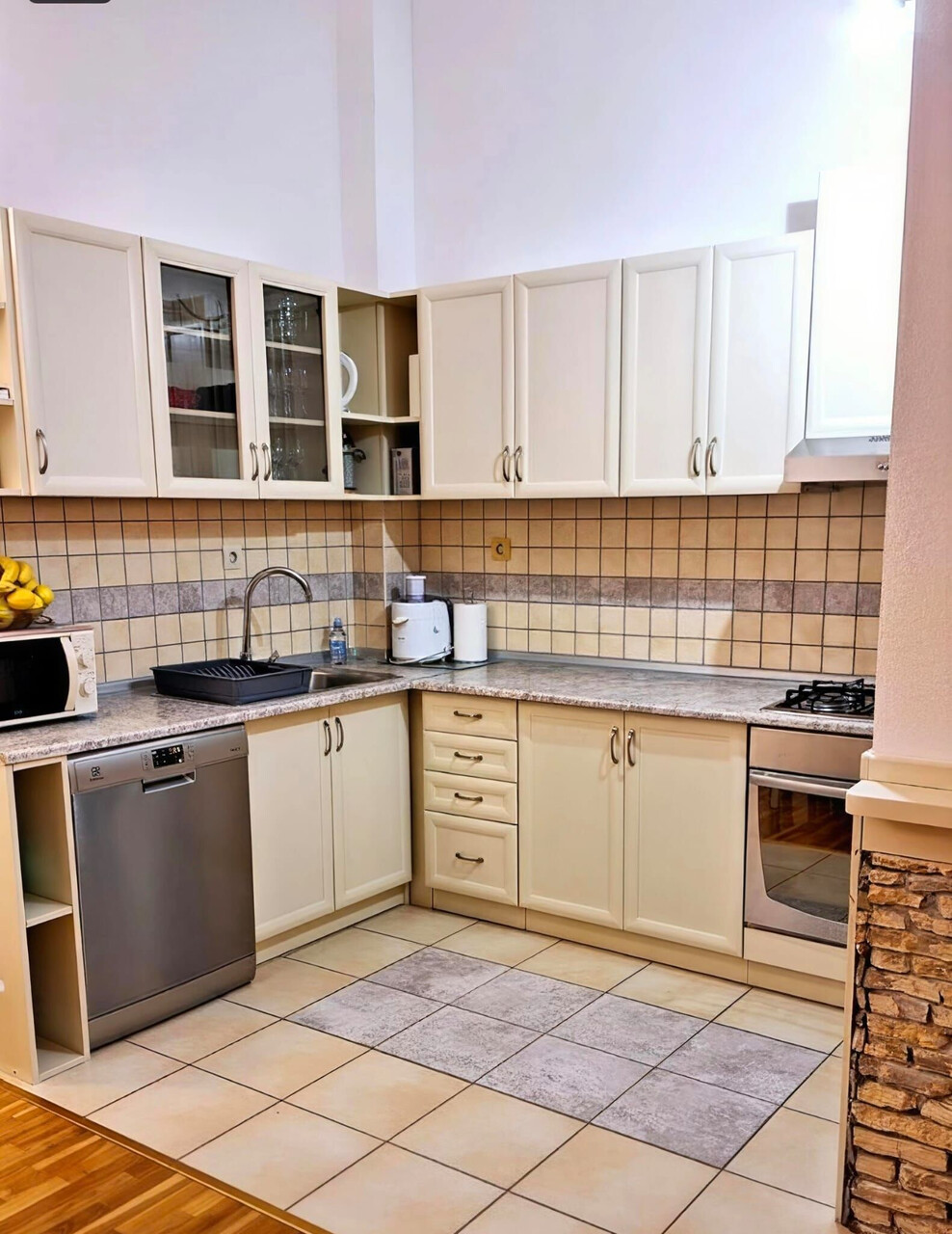 • stół i krzesła, zlew, piekarnik, lodówka, zamrażarka, czajnik, ekspres do kawy , mikrofalówka, zmywarka, kuchenka.