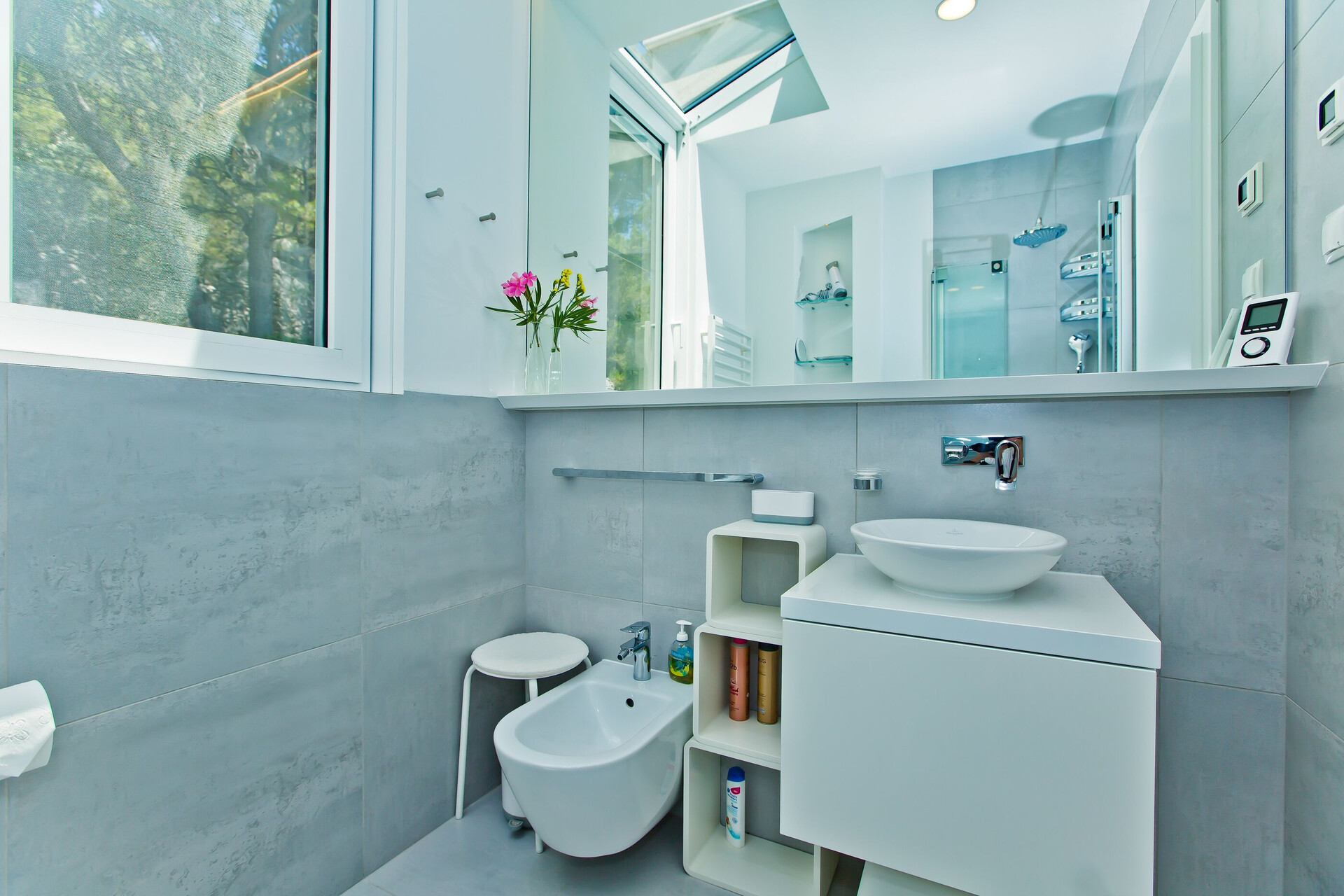 • prysznic, prysznicowa kabina, suszarka do włosów, recznik.