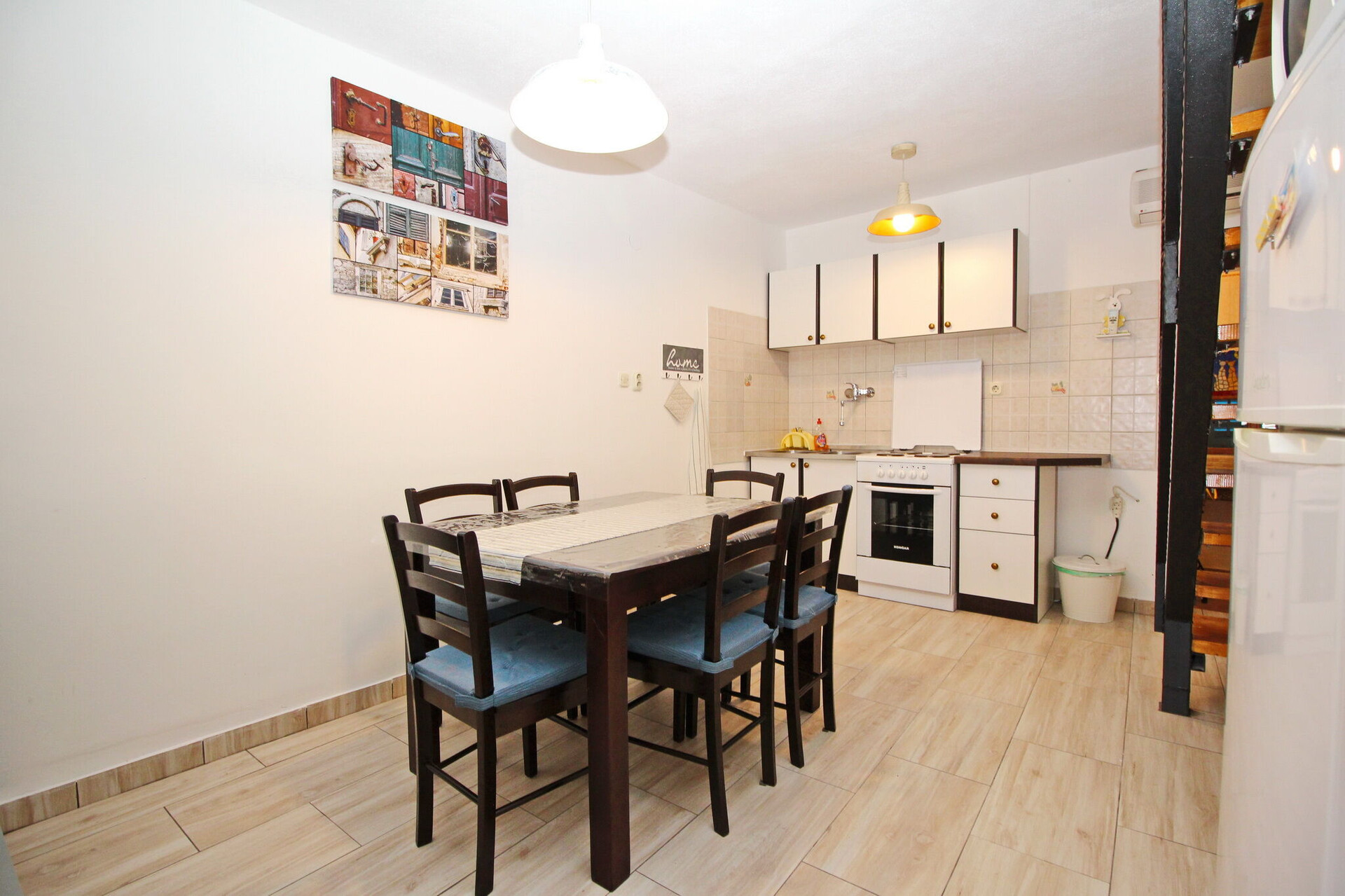 • stół i krzesła, zlew, lodówka, zamrażarka, ekspres do kawy , mikrofalówka, kuchenka.