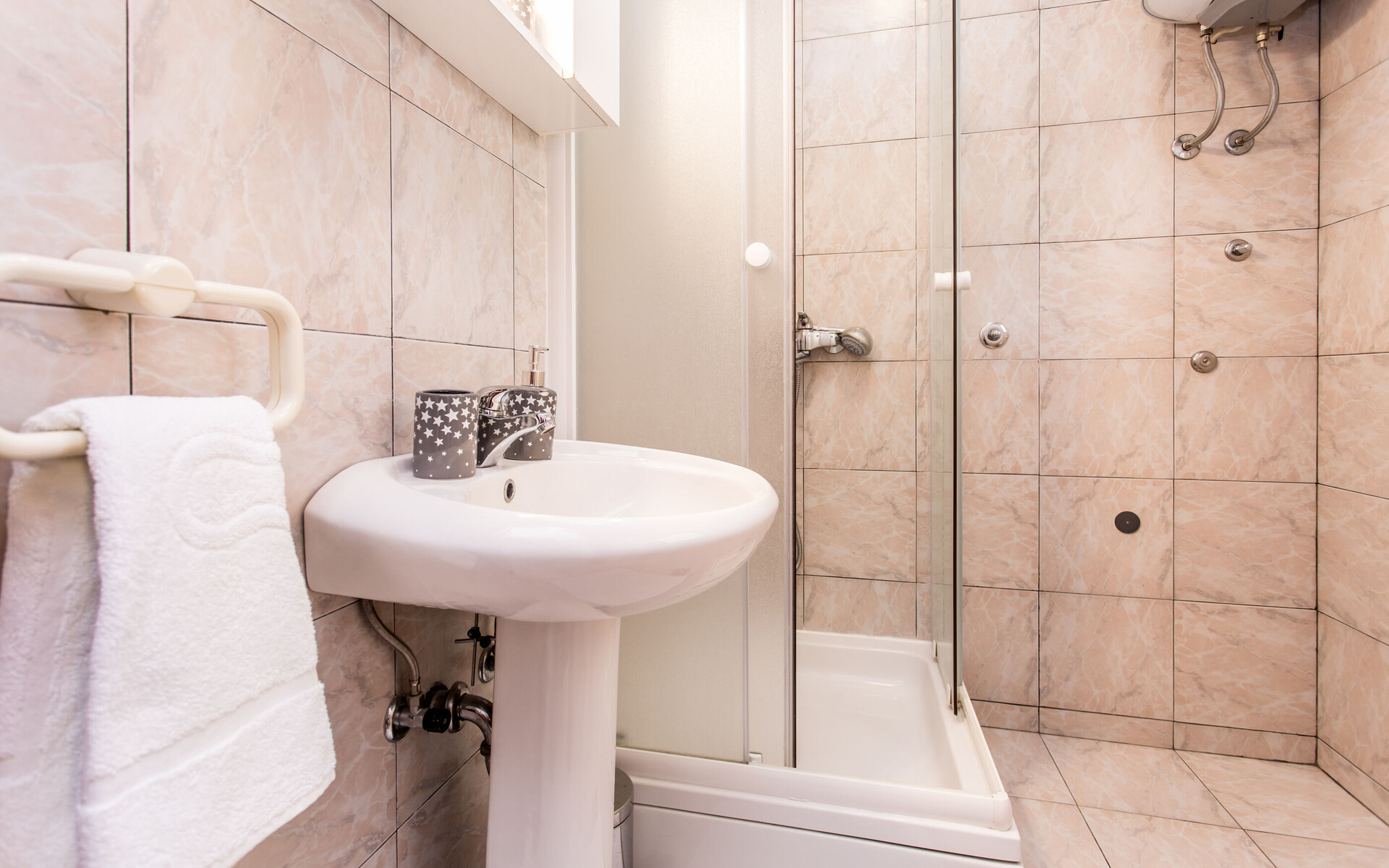 • prysznic, prysznicowa kabina, suszarka do włosów, recznik.