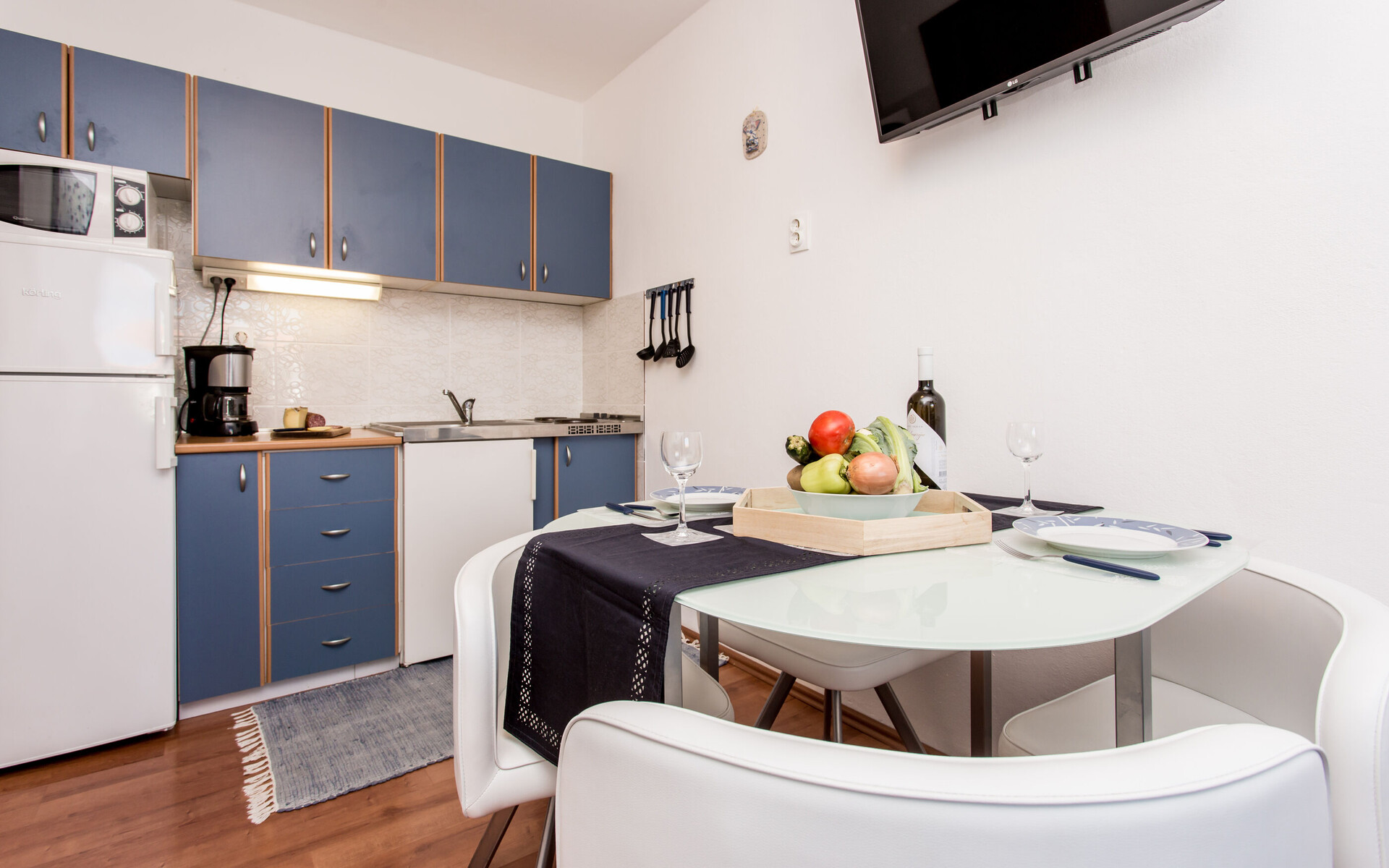 • stół i krzesła, zlew, piekarnik, lodówka, zamrażarka, czajnik, ekspres do kawy , mikrofalówka, toster, zmywarka, kuchenka.