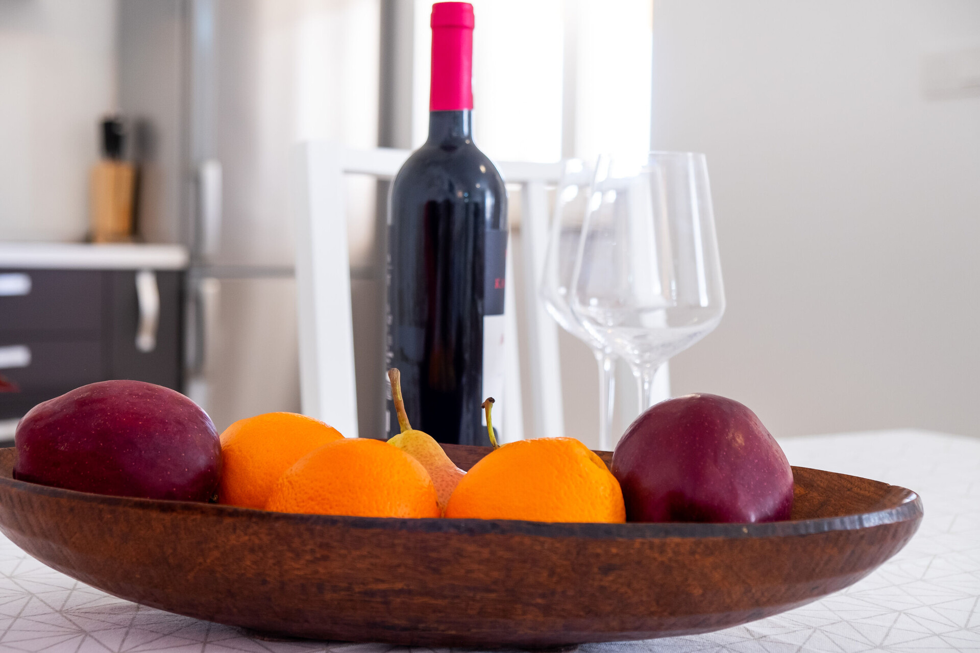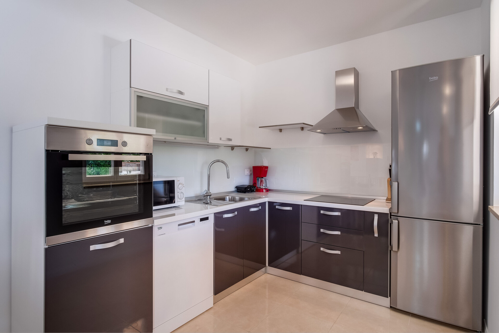 • stol i stolice, sudoper, rerna, frižider, aparat za filter kafu, mikrovalna, toster, mašina za pranje sudova, ploča za kuhanje.