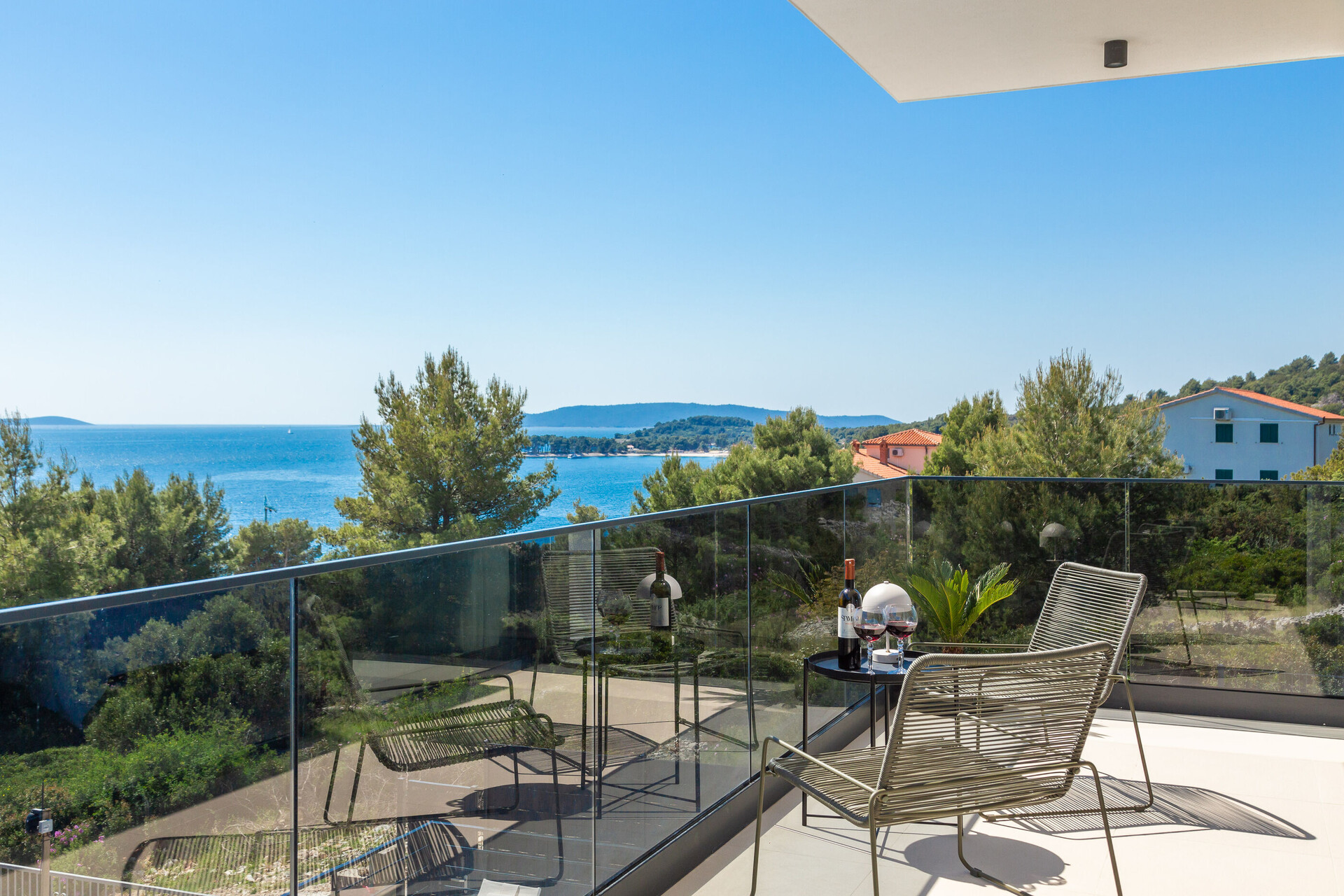 • brezplačen wifi, pogled na morje, kvadratura notranjega prostora je 200 m2 (brez dvorišča in terase), spalnic: 5, kopalnic: 5, balkona: 1, klimatska naprava všteta v ceno, TV, satelitski programi.