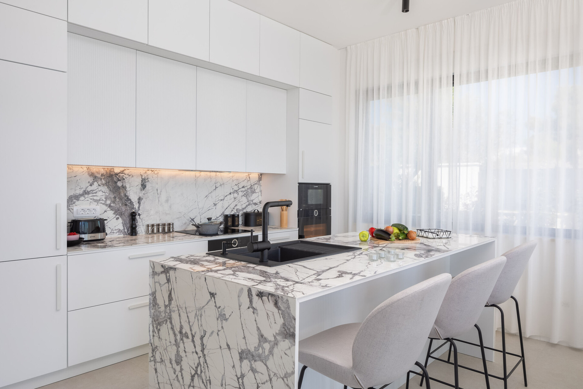 • miza in stoli, pomivalno korito, pečica, hladilnik, zamrzovalnik, aparat - kuhalnik za vodo, aparat za filter kavo, mikrovalovka, opekač, pomivalni stroj, likalnik, kuhalna plošča.