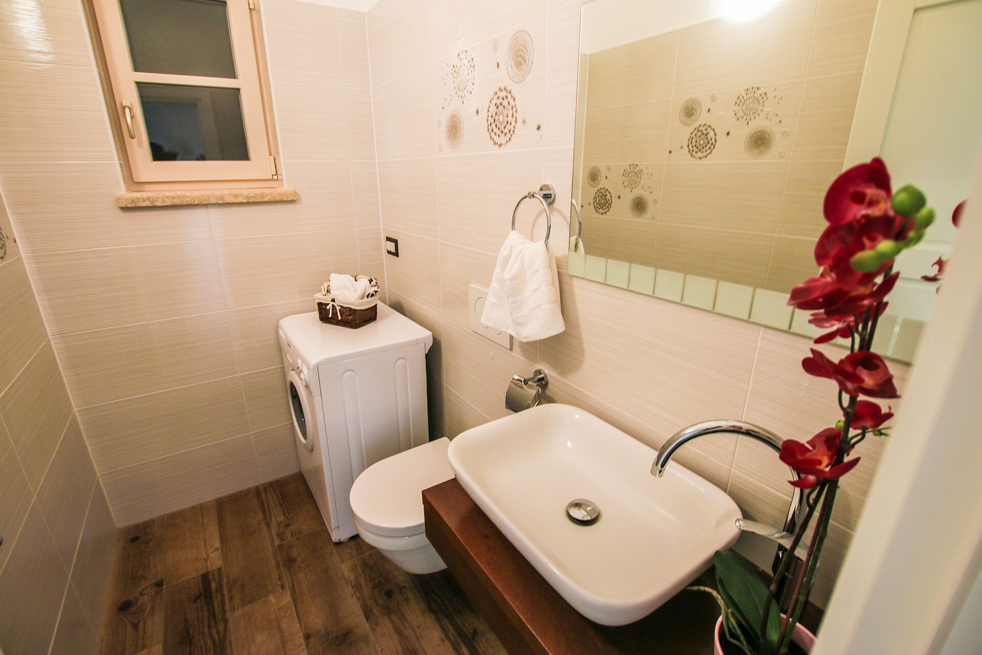 • tuš, tuš kabina, pralni stroj, fen, brisače.