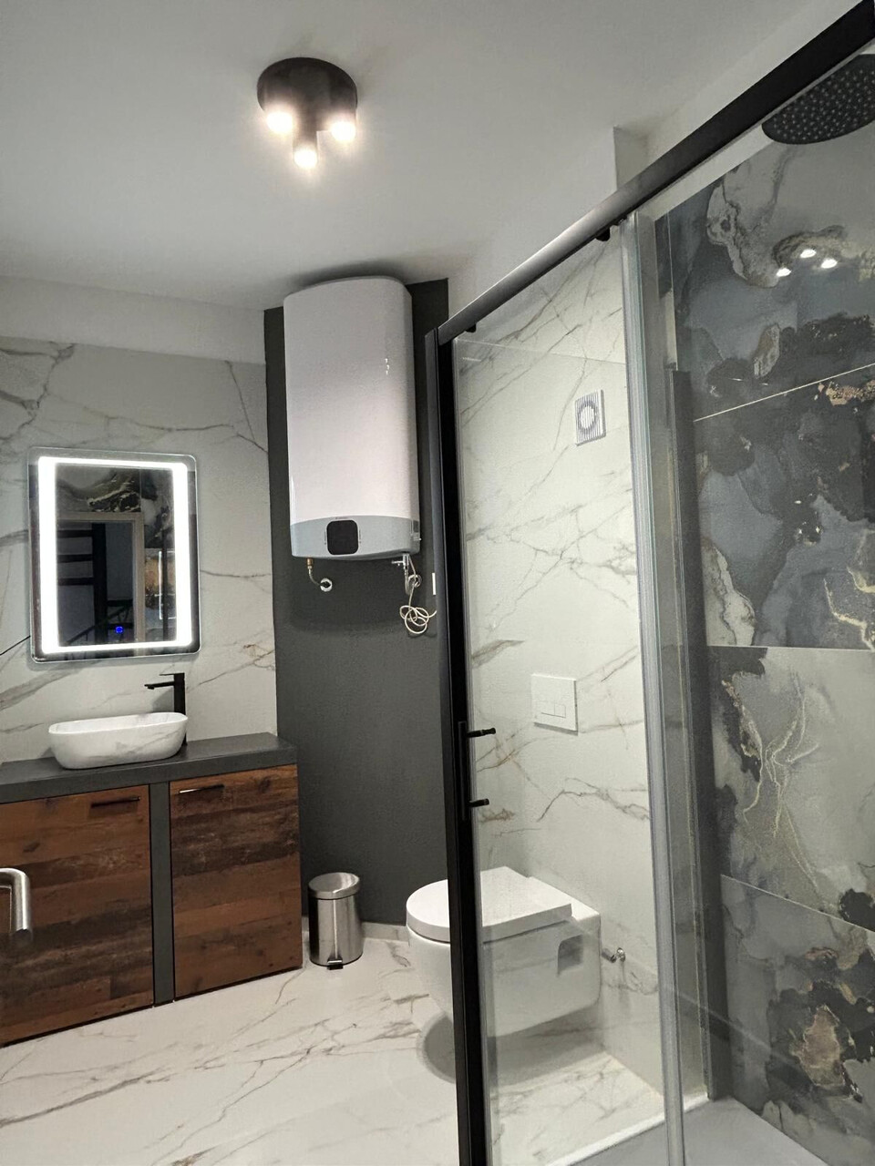 • tuš, tuš kabina, pralni stroj, fen, brisače.