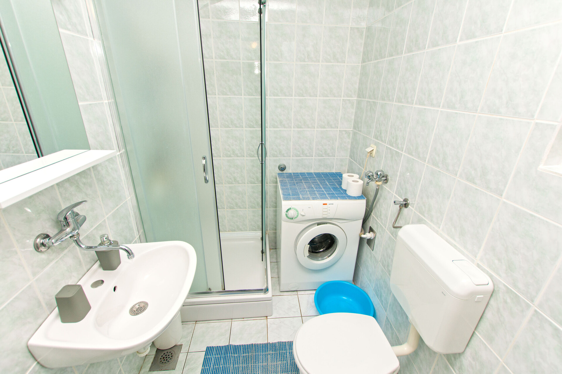• tuš, tuš kabina, pralni stroj, fen, brisače.
