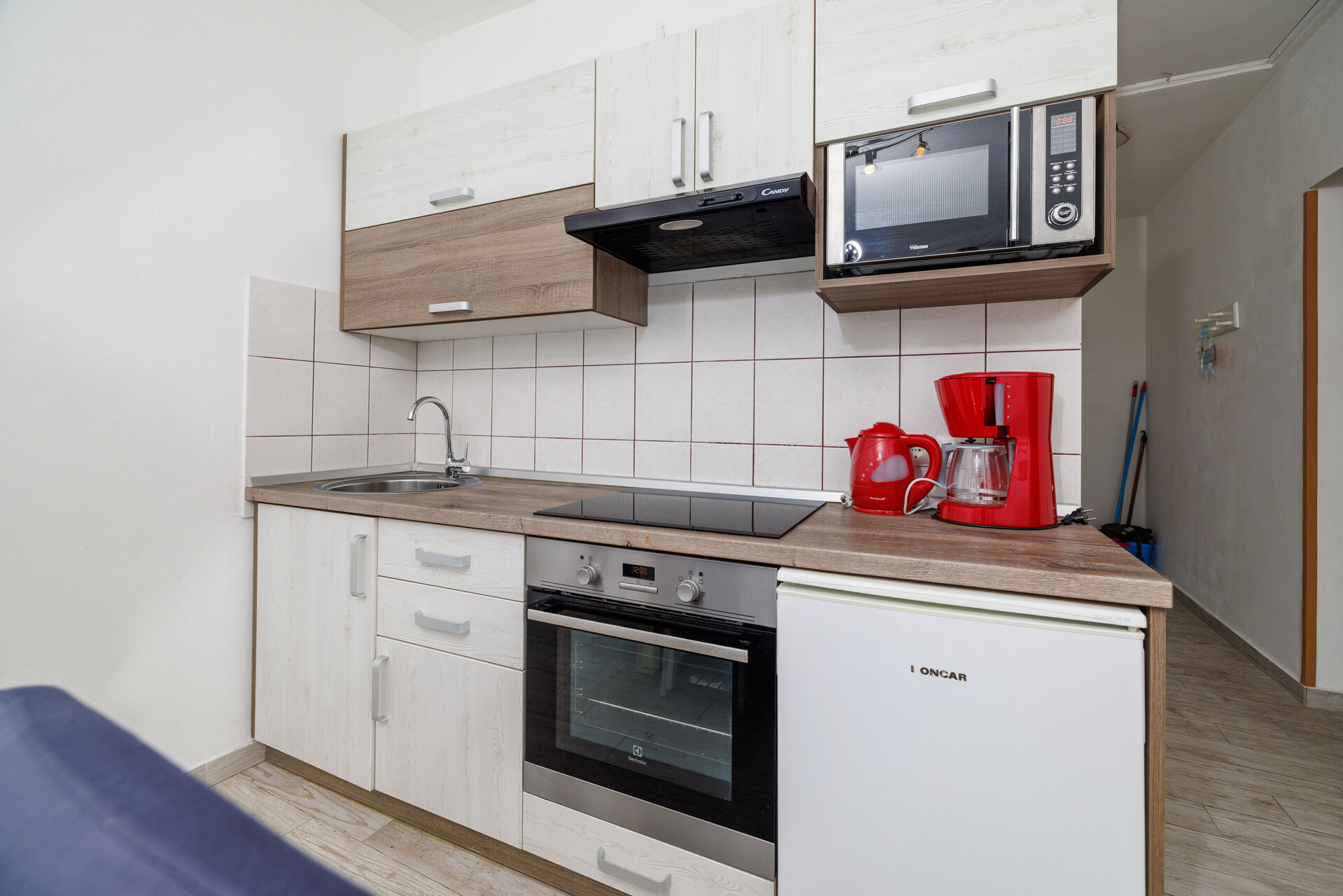 • miza in stoli, pomivalno korito, pečica, hladilnik, aparat za filter kavo, mikrovalovka, likalnik, kuhalna plošča.