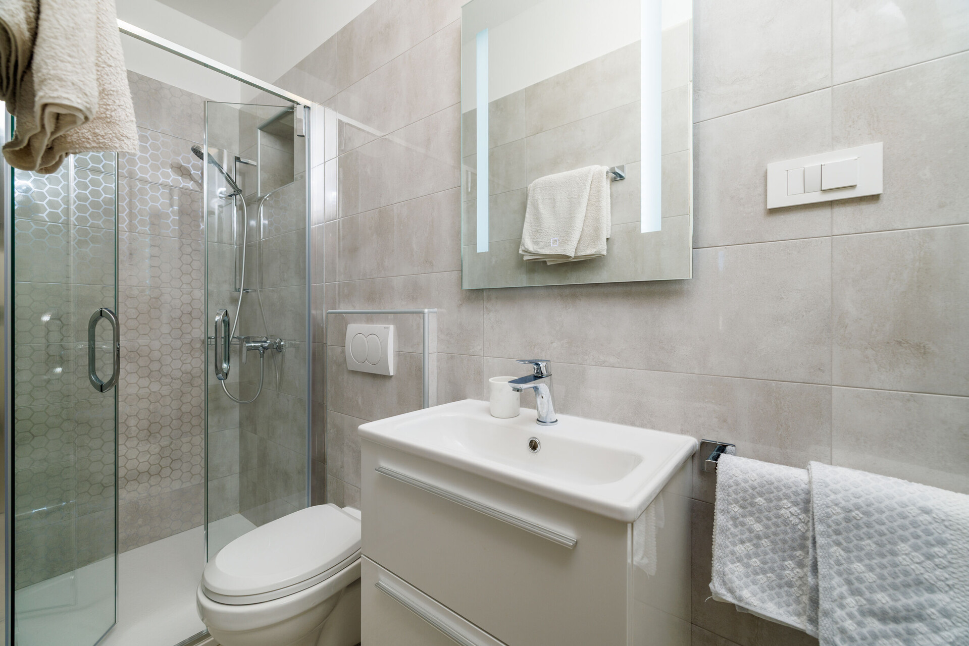 • tuš, tuš kabina, brisače.