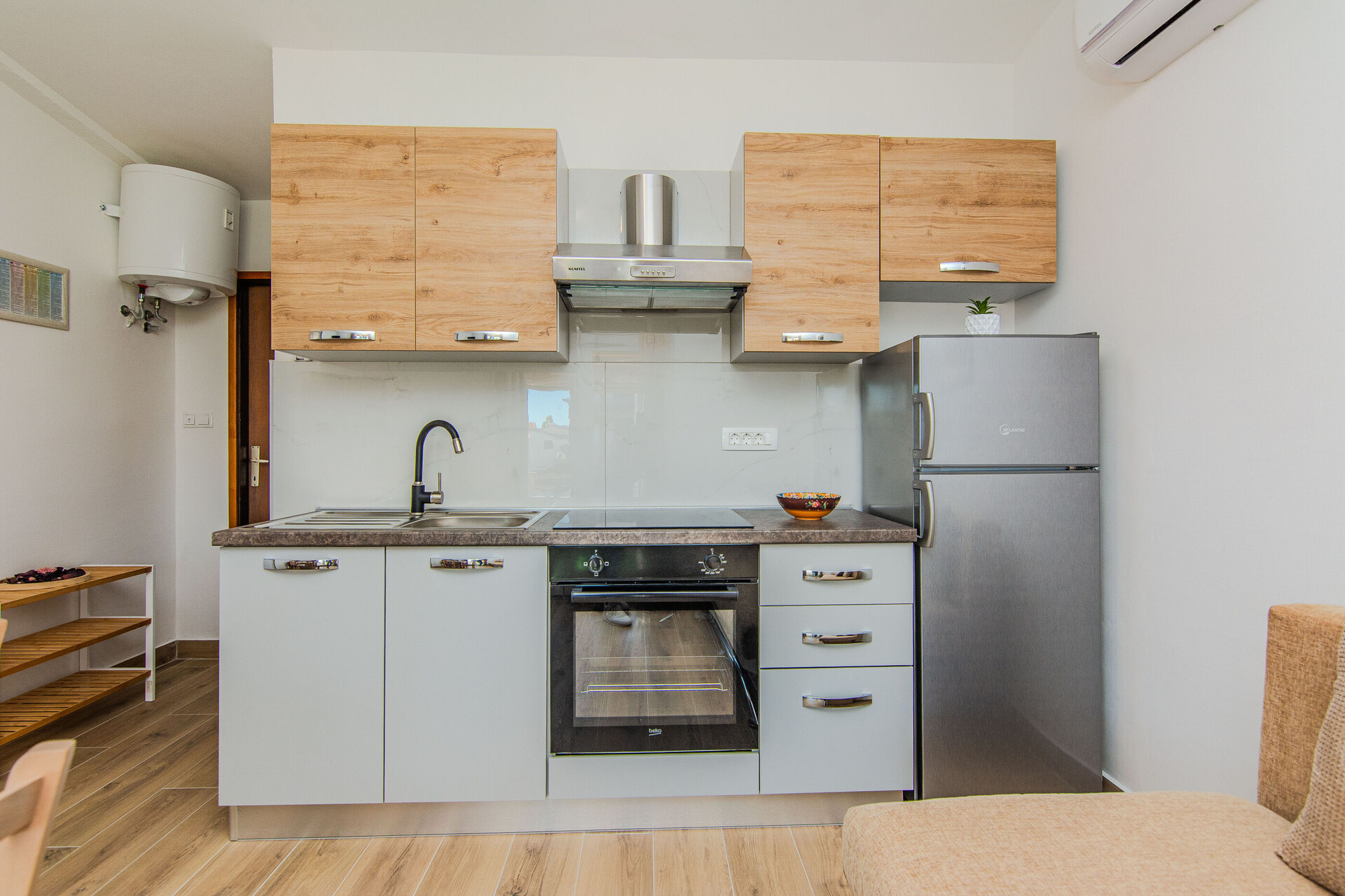 • miza in stoli, pomivalno korito, hladilnik, aparat za filter kavo, opekač, kuhalna plošča.