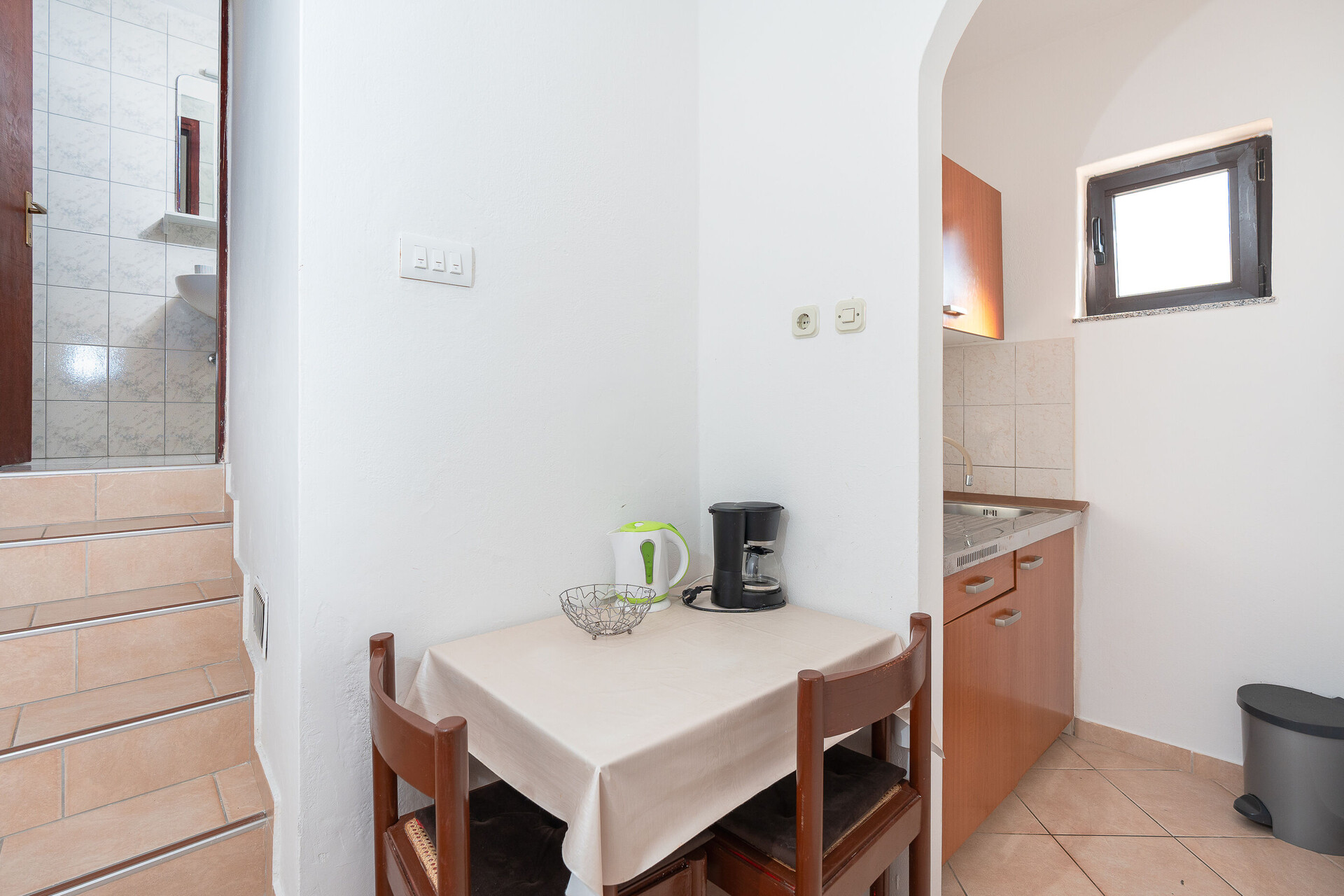 • miza in stoli, pomivalno korito, hladilnik, zamrzovalnik, aparat za filter kavo, opekač, kuhalna plošča.
