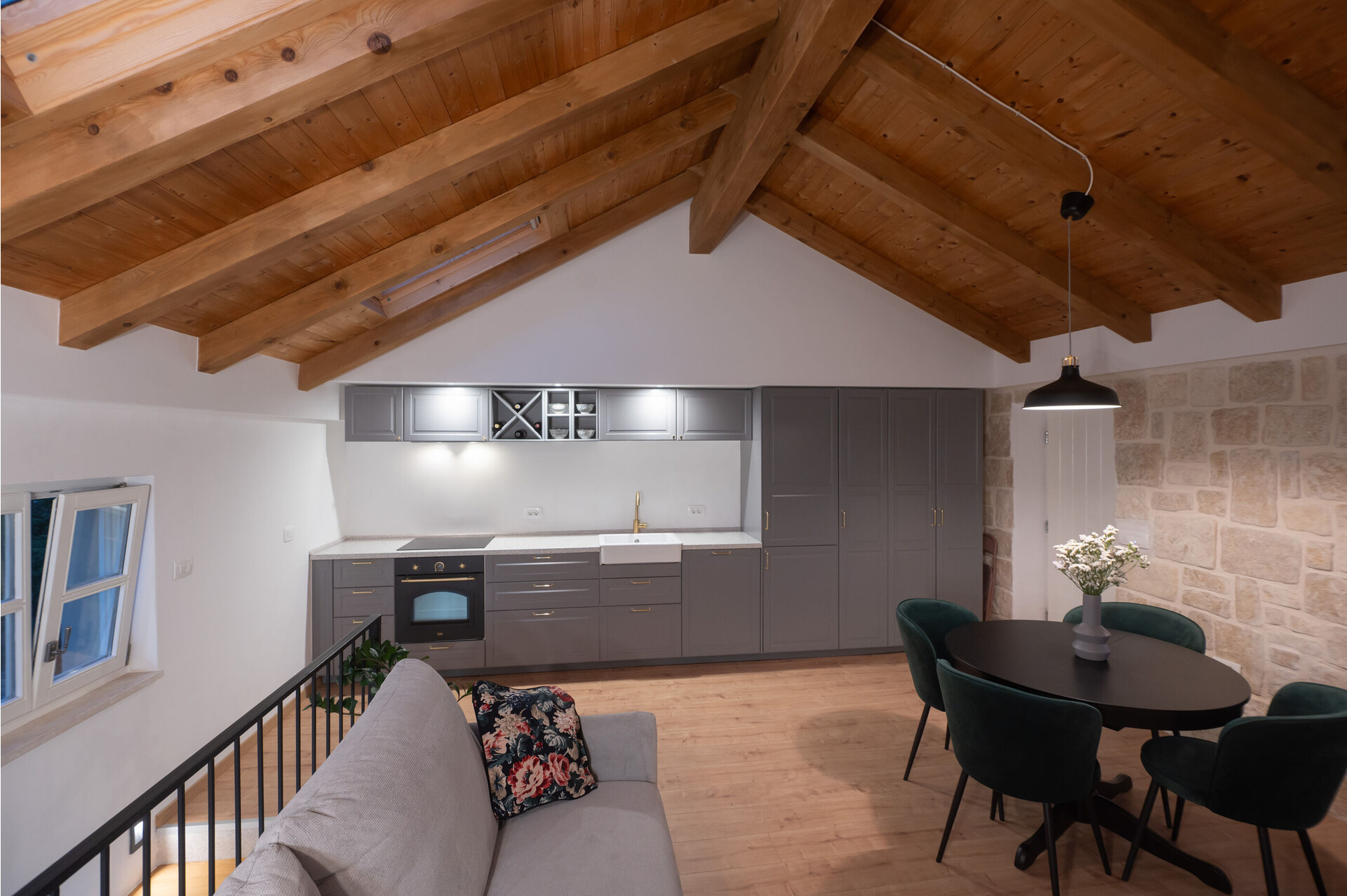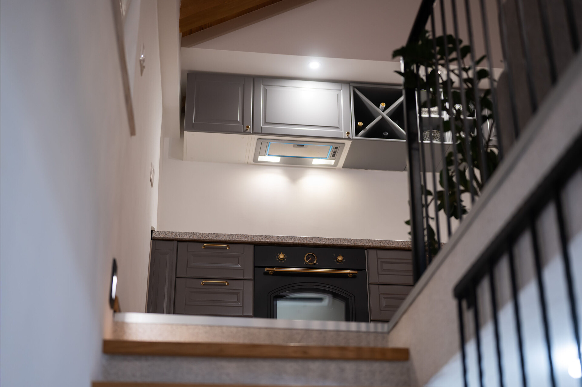 • miza in stoli, pomivalno korito, pečica, hladilnik, zamrzovalnik, aparat - kuhalnik za vodo, aparat za filter kavo, mikrovalovka, opekač, pomivalni stroj, likalnik, kuhalna plošča.