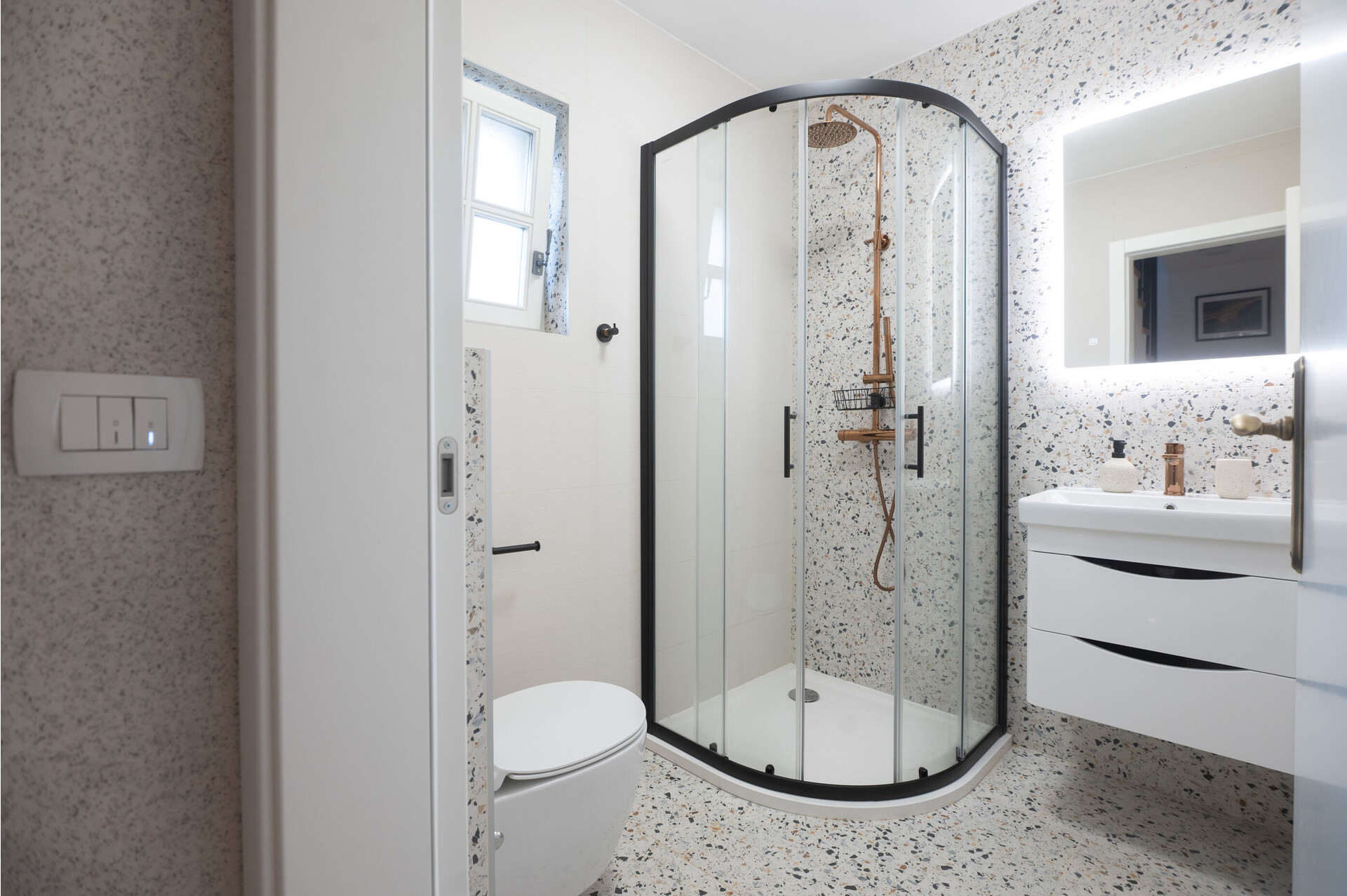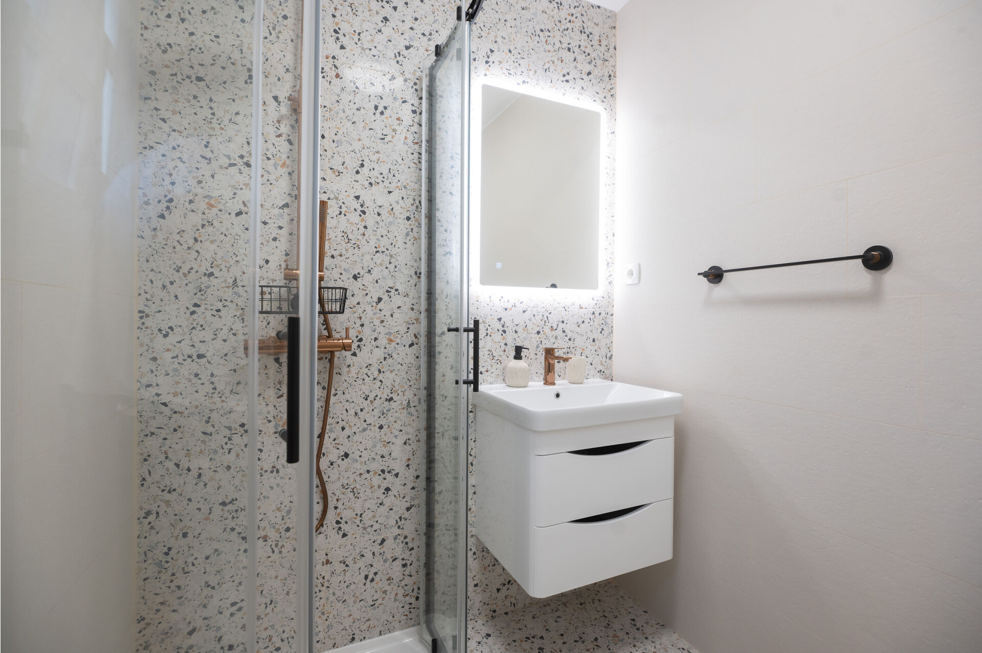 • tuš, tuš kabina, pralni stroj, fen, brisače.