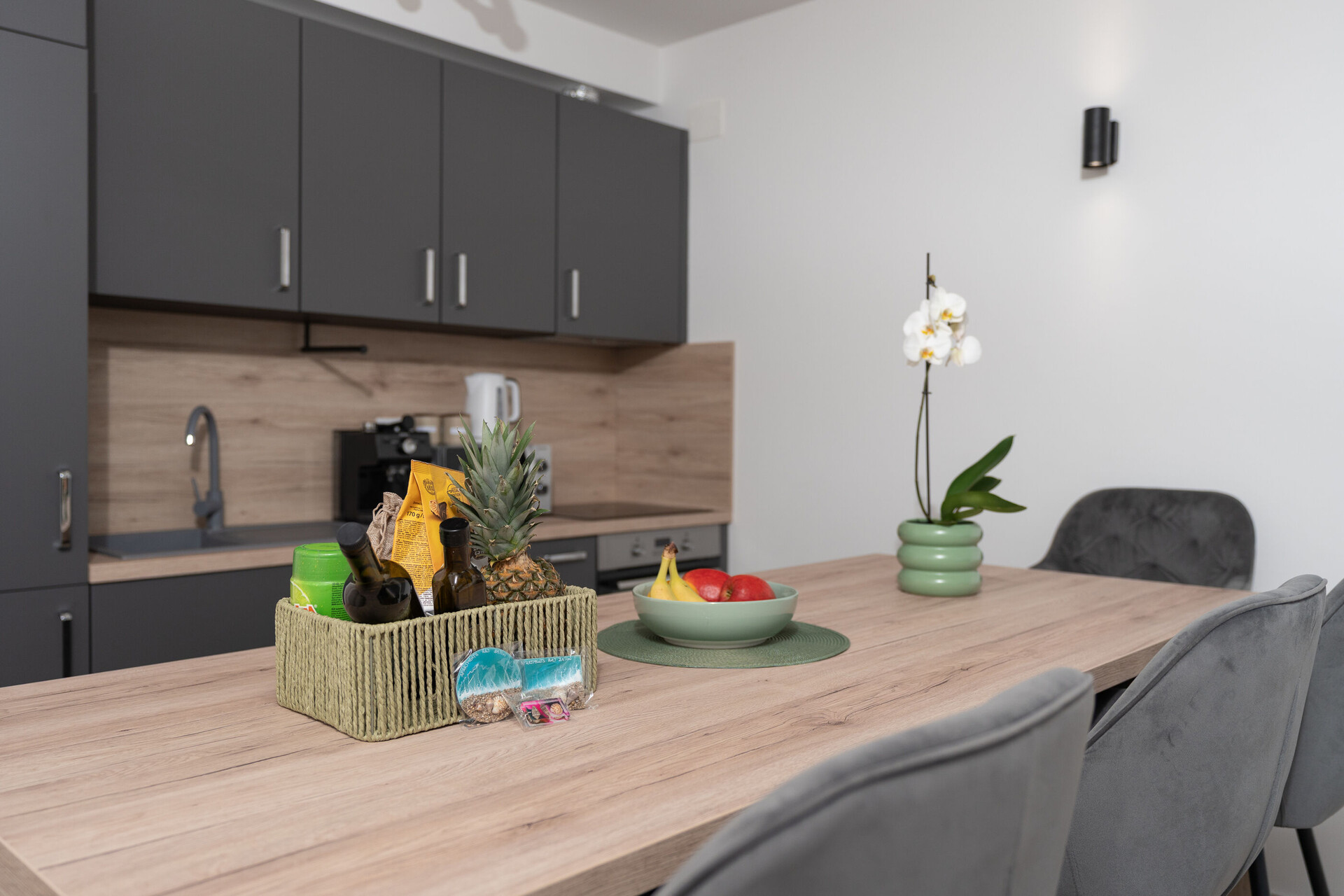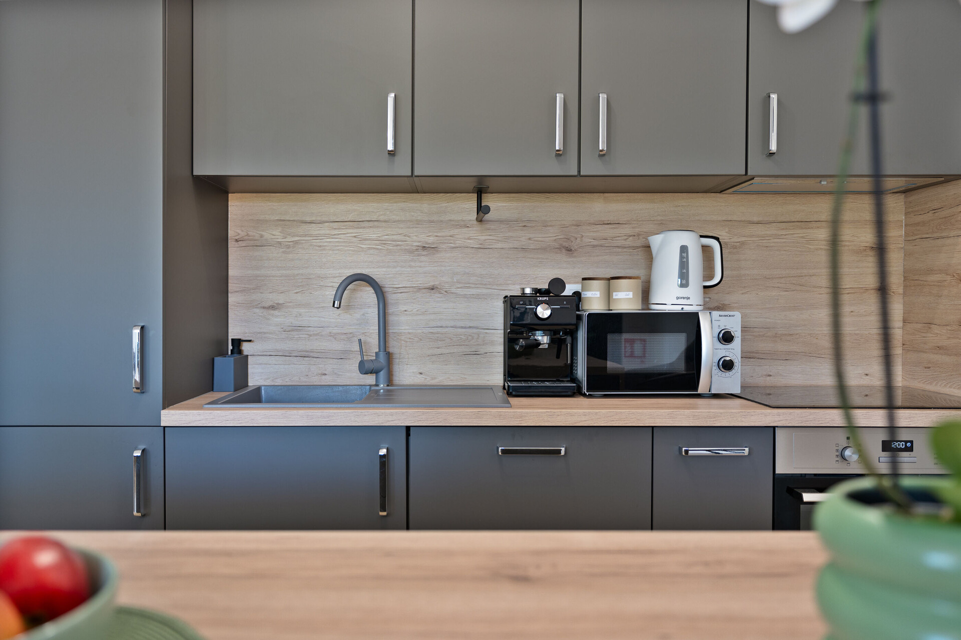• miza in stoli, pomivalno korito, pečica, hladilnik, zamrzovalnik, mikrovalovka, kuhalna plošča.