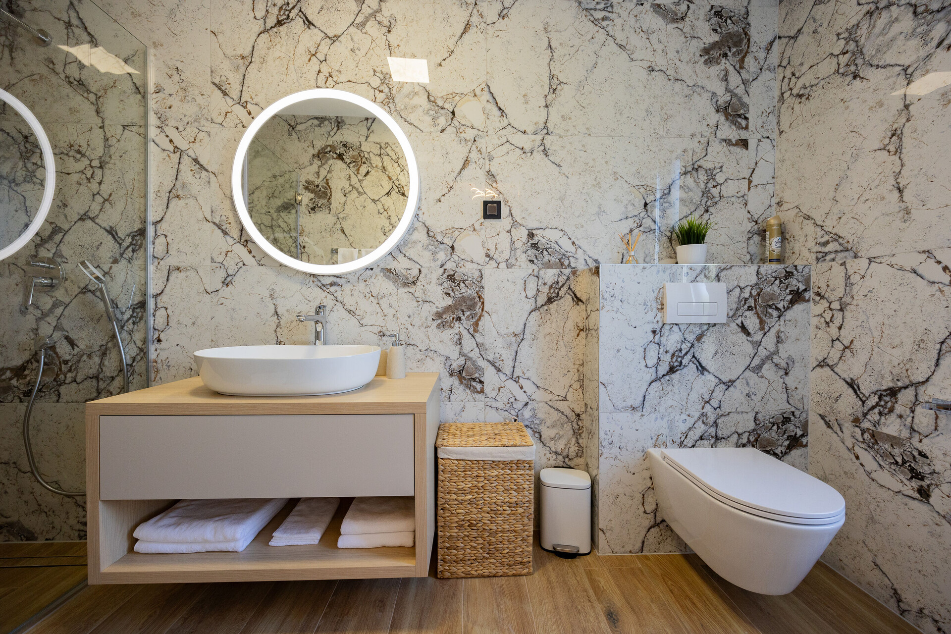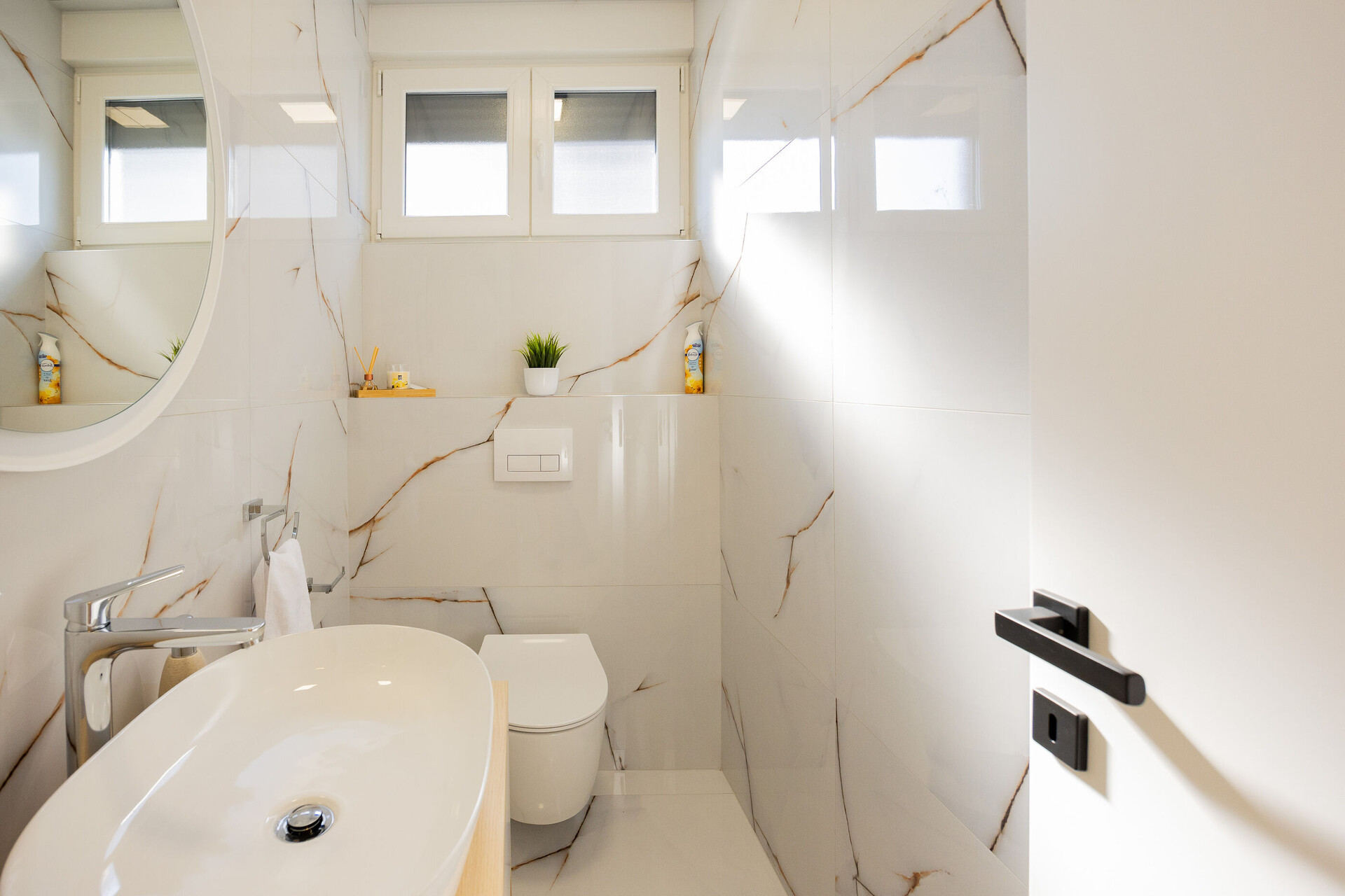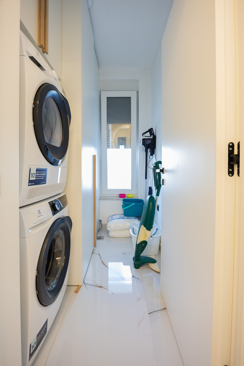 • tuš, tuš kabina, pralni stroj, fen, brisače.