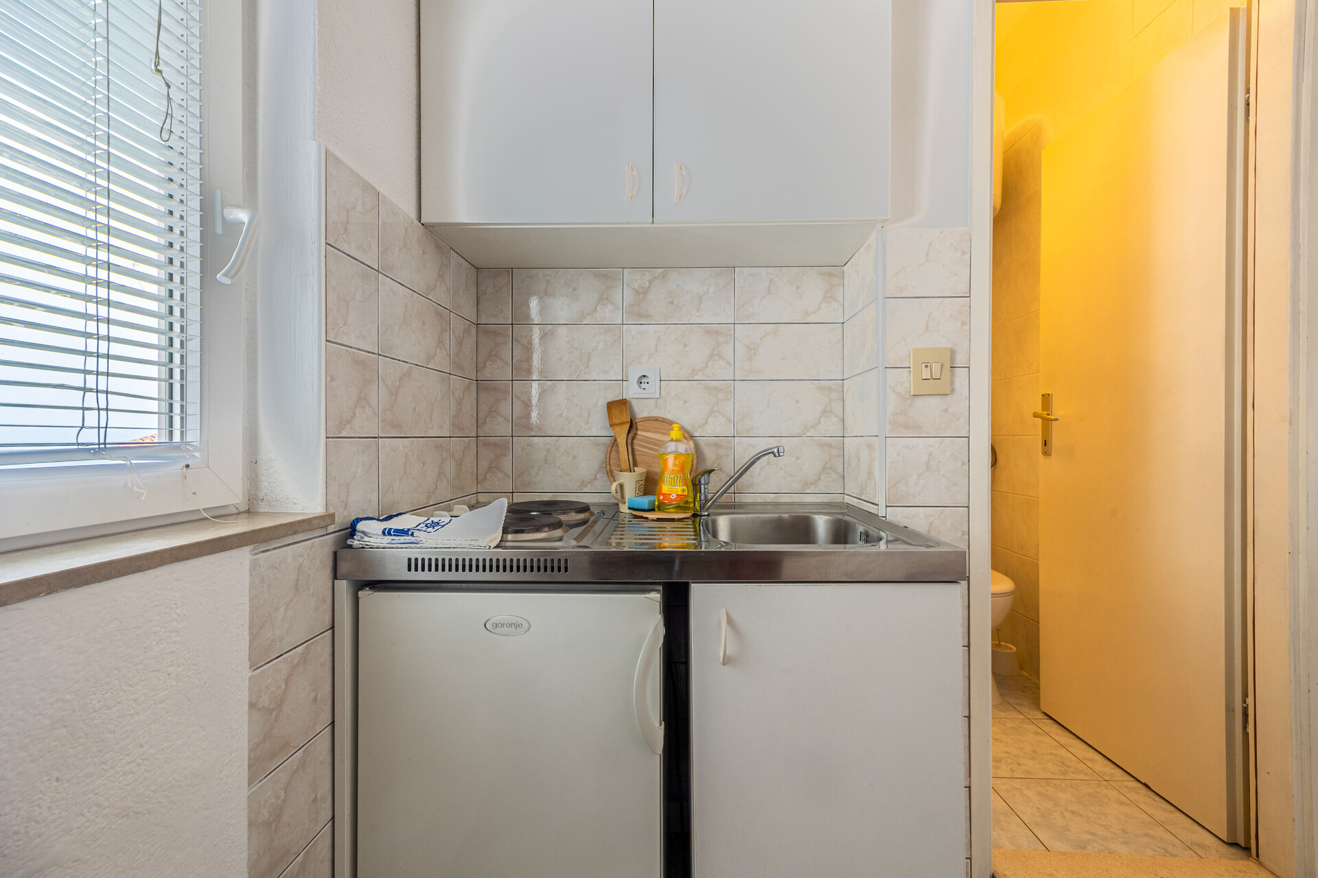 • miza in stoli, pomivalno korito, hladilnik, zamrzovalnik, aparat - kuhalnik za vodo, kuhalna plošča.