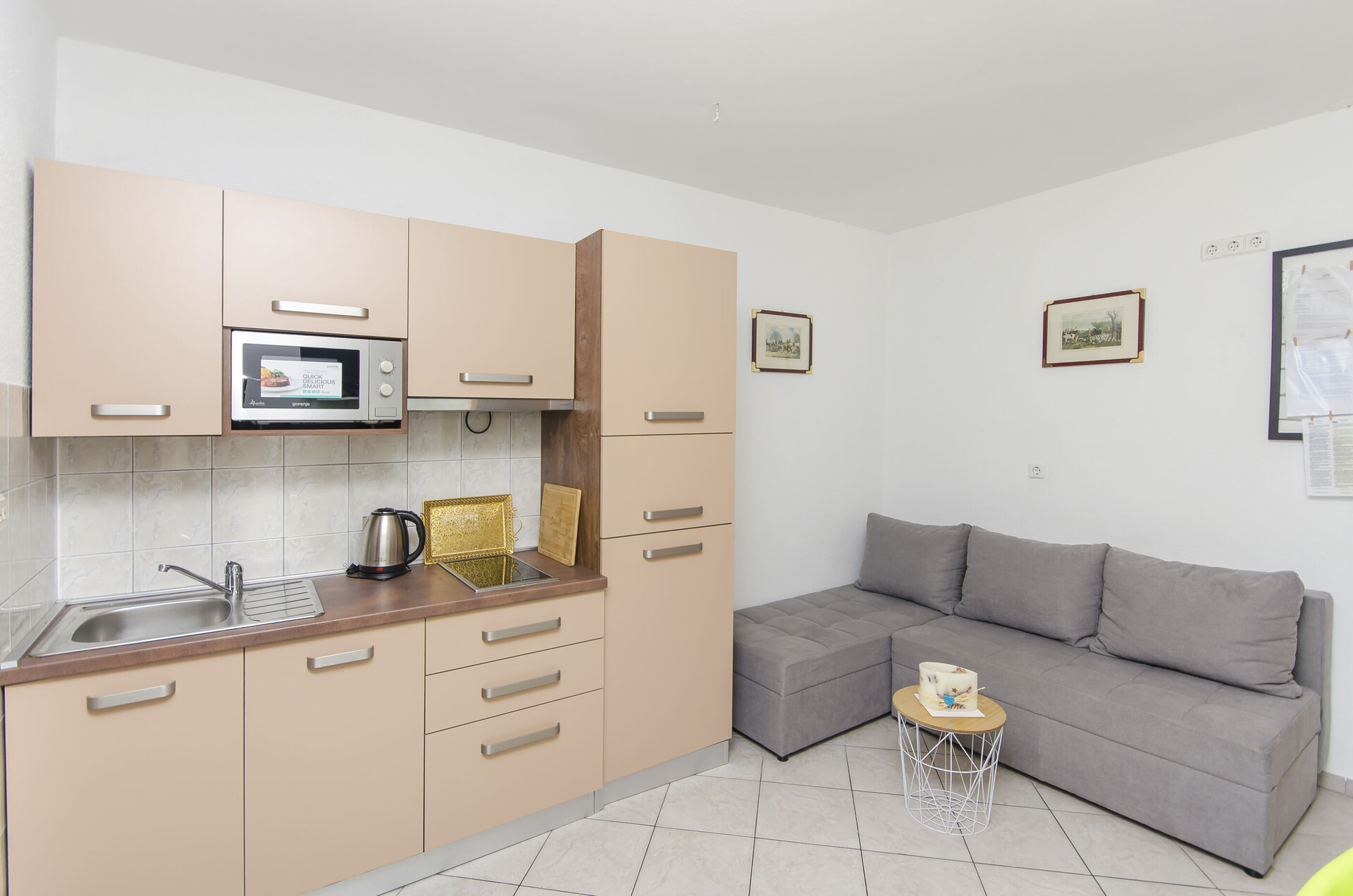 • miza in stoli, pomivalno korito, pečica, hladilnik, zamrzovalnik, aparat - kuhalnik za vodo, aparat za filter kavo, mikrovalovka, likalnik, kuhalna plošča.