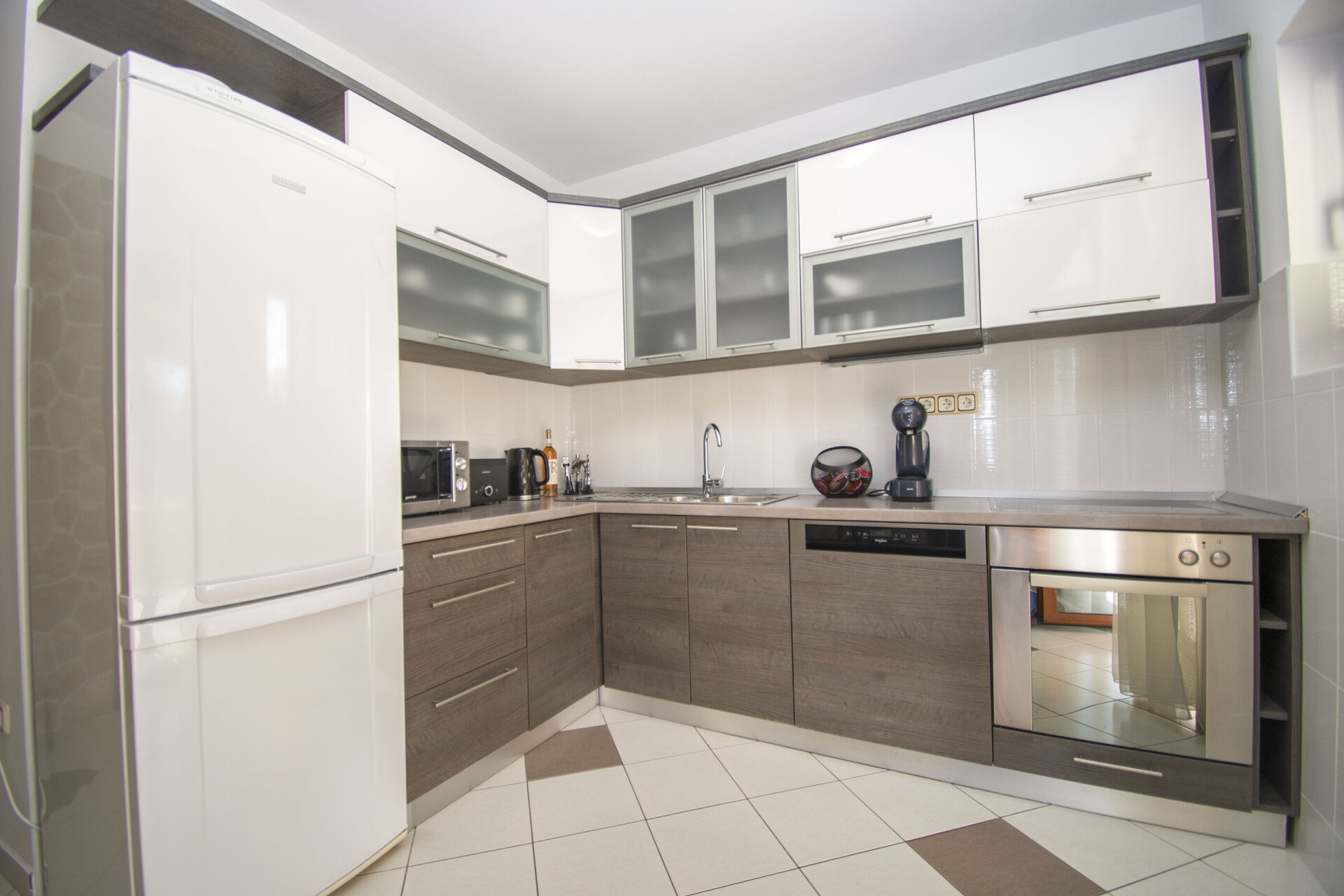 • miza in stoli, pomivalno korito, pečica, hladilnik, zamrzovalnik, aparat - kuhalnik za vodo, aparat za filter kavo, mikrovalovka, opekač, pomivalni stroj, kuhalna plošča.