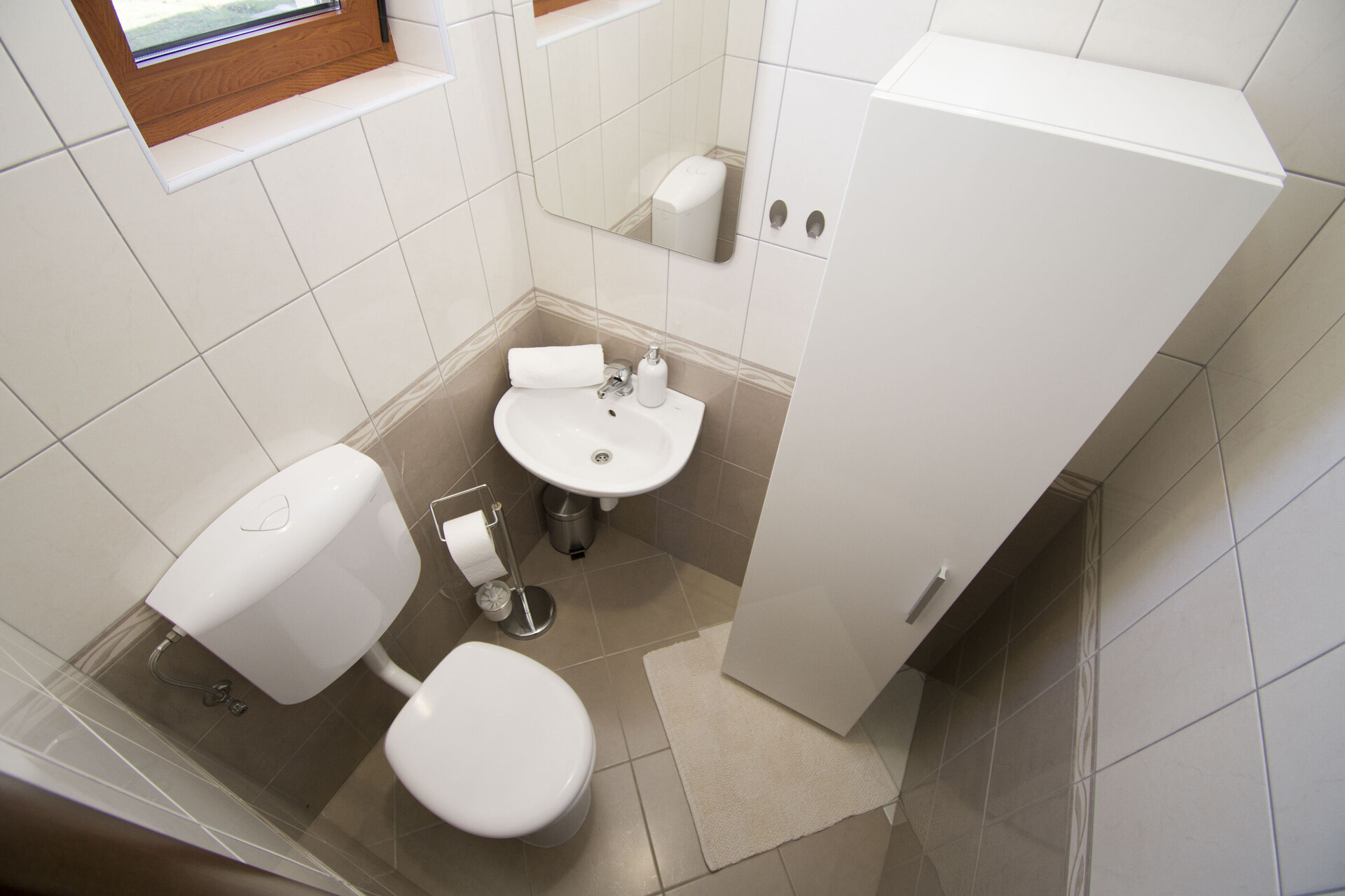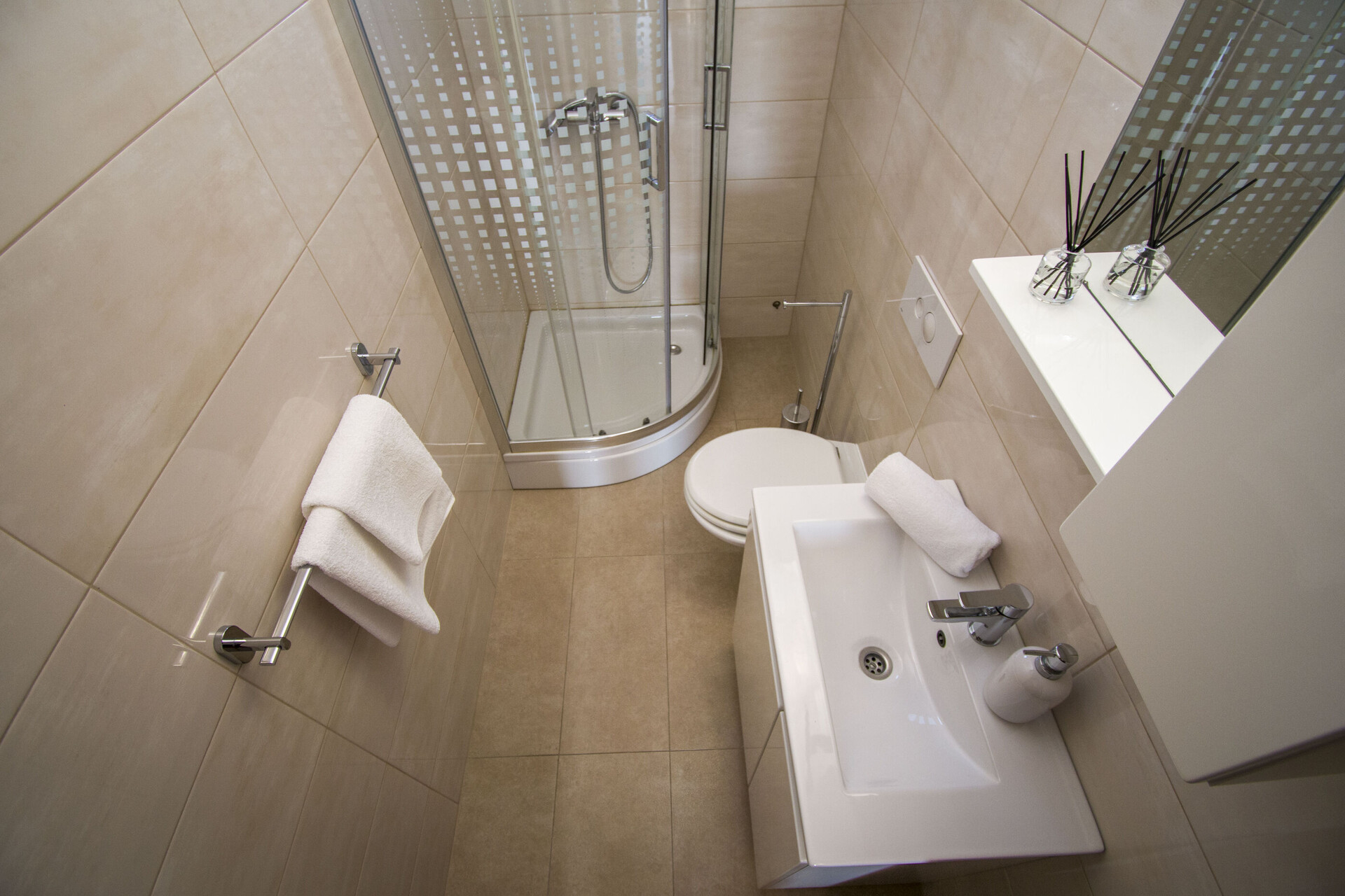 • tuš, tuš kabina, brisače.