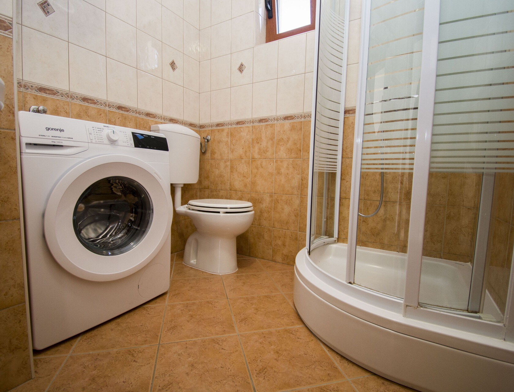 • tuš, tuš kabina, pralni stroj, fen, brisače.